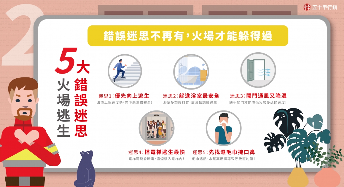 儘管已經做好防火自我檢測,倘若還是不幸遇到火災,又該如何提高當下的存活率?火場逃生知識人人都該具備,以下五大常見逃生錯誤迷思,我們為你一一破解!