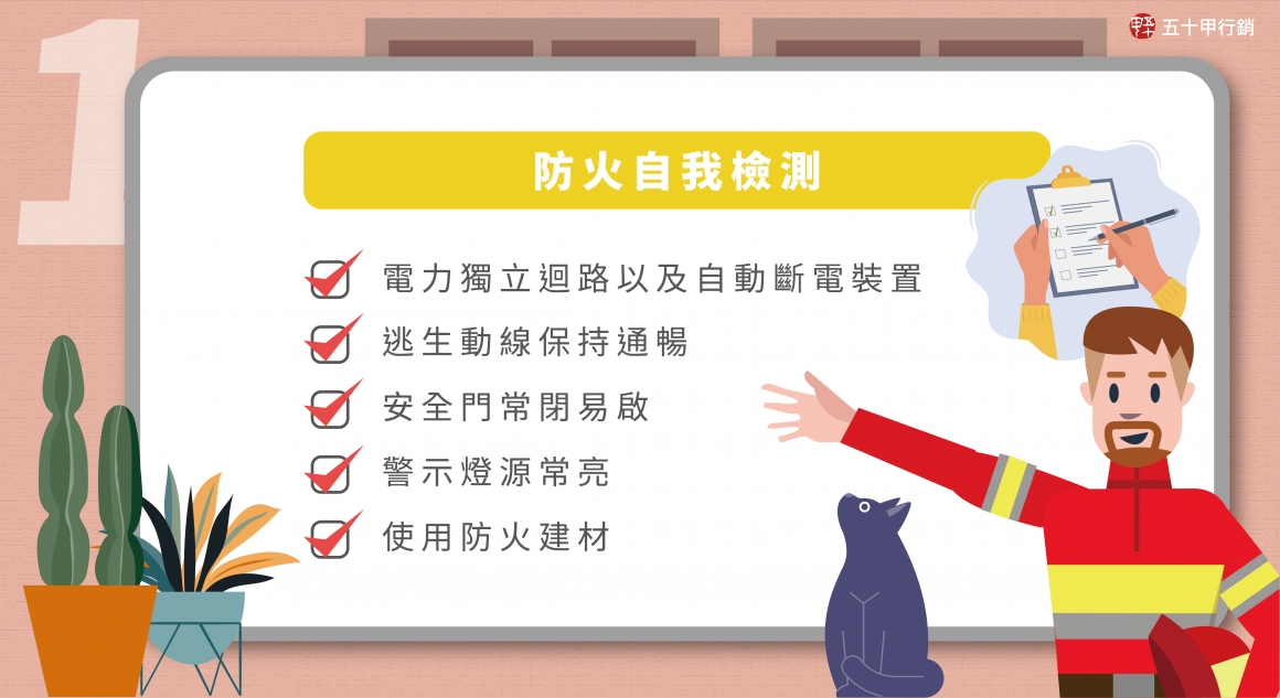 當前消防法令規定,六層樓以上及一定規模的建築,須依法落實「防火管理制度」及「裝設消防安全設備」,而一般五層樓以下的住宅,並沒有法令強制要求。驚人的是,火場的罹難者有超過90%,是死於五層樓以下的建築物。因此不僅法定的基本防火制度,我們更該定期進行以下五點防火自我檢測,以加強保障自身居住環境的安全: