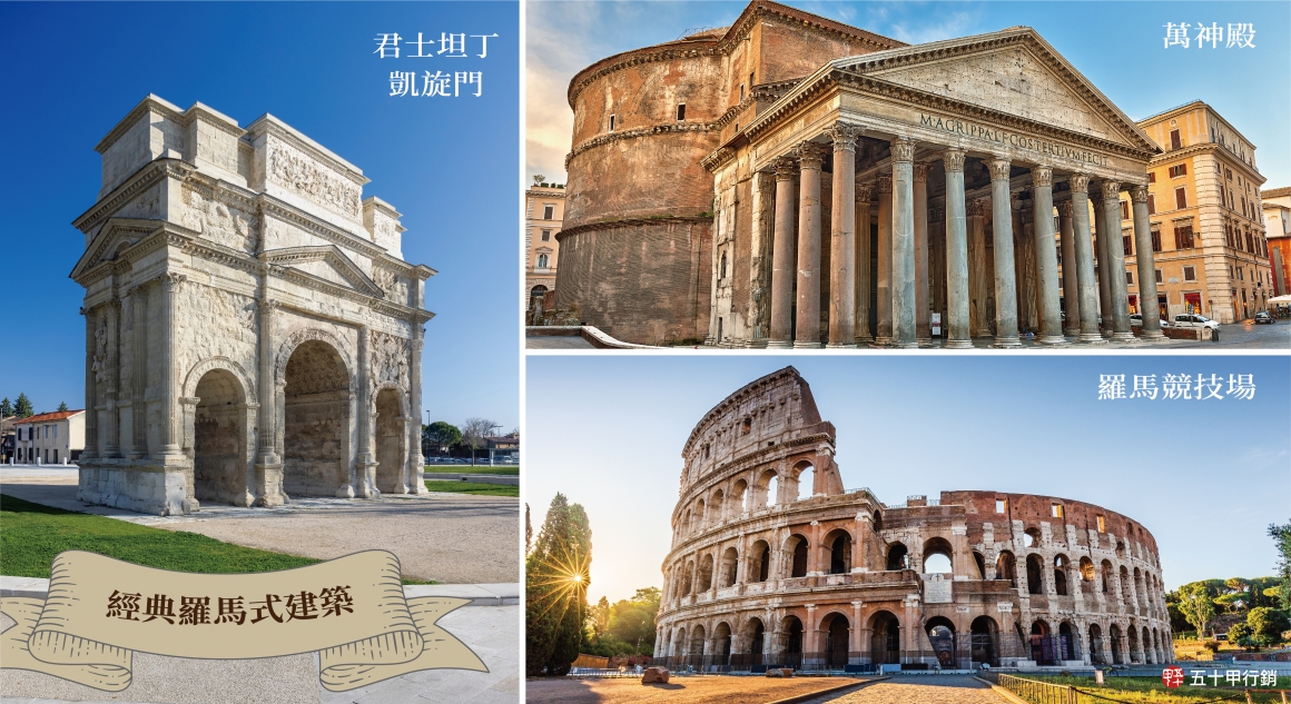 ●拱券:為羅馬建築最大特色,將拉應力轉化為壓應力。十字拱和拱券平衡體系的發展,使建築僅需四角有支柱,不必有連續的承重牆,克服了樑柱結構不能創造出寬闊內部空間的問題,此技術大量使用於陵墓、橋梁、城門、輸水渠等大型建築、工程中,從此大拱門、大圓頂都能獨立,實現了羅馬無比宏偉壯麗的眾多建築,如凱旋門、萬神殿、羅馬競技場等等。