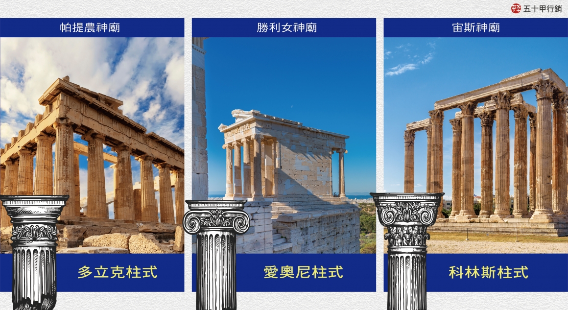 古希臘為歐洲文化的發源地,深深影響著後代的建築走向。發展時至大約為公元前8至前1世紀,實現了由木建築演變至石材建築的革命,由於該時期信仰的廣泛盛行,各式神廟成為古希臘建築中最常見,也最值得稱道的,而其中又以列柱最為著名,不僅柱頭不相同,柱身長細比例也有所區別,以下為三種風格成熟的列柱分類: